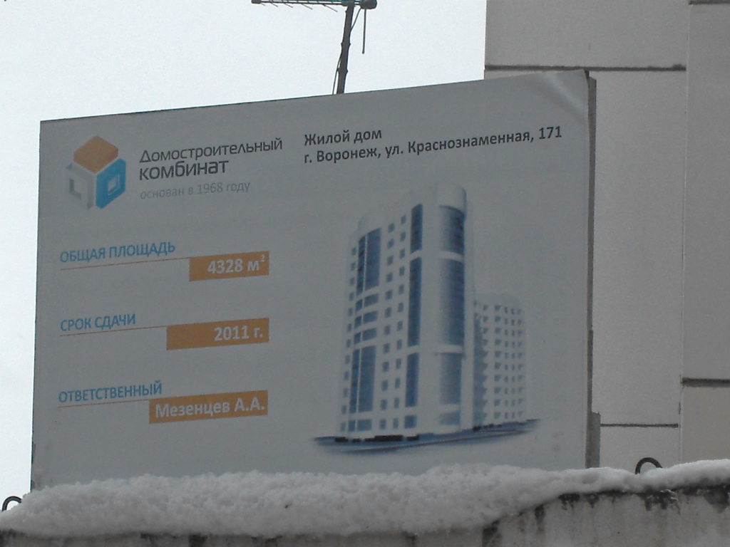 Выложили на сайт дом в Воронеже на 372 однокомнатные квартиры общей площадью 5276 кв м , кв-ры получаются по 14,2 кв м, это гораздо ниже нормы И застройщика исковеркали: ЗАО"Электорнжилсоц" ВМЕСТО ЗАО"Электронжилсоц" Косяк какой-то, что хотят то и пишут и ни кто ни за что не отвечает!!! 8.02.11 буду в Воронеже, обязательно заеду на ул. Краснознамённую и Урывского, посмотрю как и что, сделаю фото. Вообще Зибров (начальник ВВАИИ, ИЛИ КАК ОН ТАМ СЕЙЧАС НАЗЫВАЕТСЯ) большую часть квартир в Воронеже "оттянул" на себя почто 100% в\сл обеспечил служебным жильём и дают нормально постоянное. Я сам в распоряжении в Тамбове, жду жильё по ИПМЖ В Воронеже на 1 чел(себя любимого), поэтому являюсь заинтересованным лицом в этой теме.
