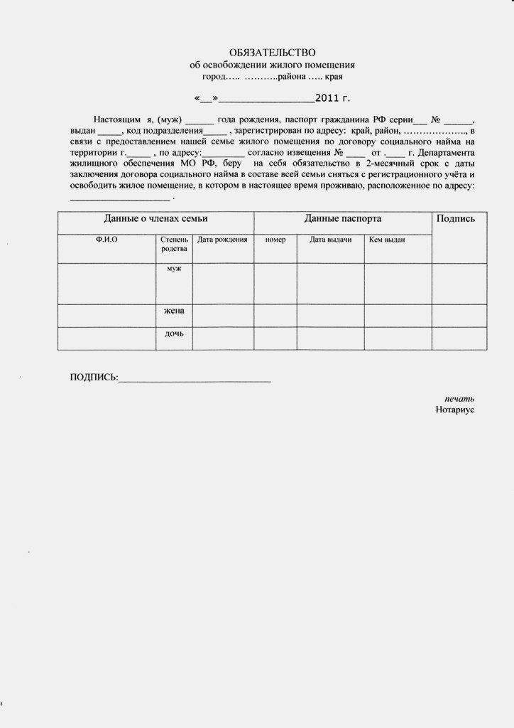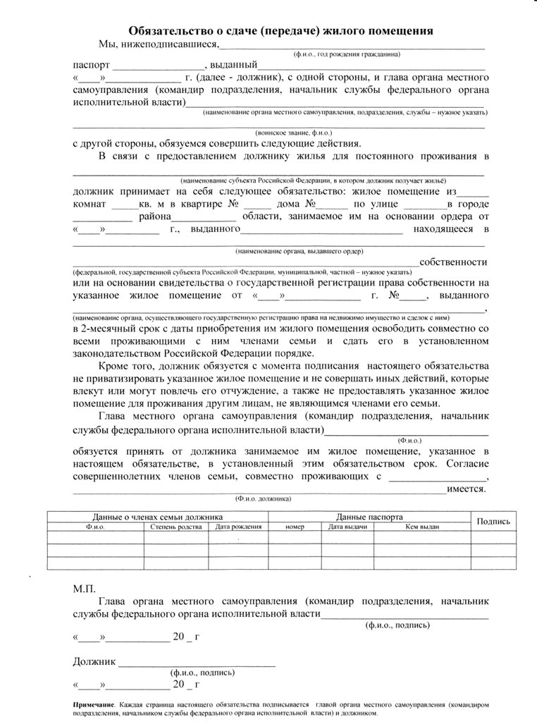 #8849Ваши объяснения понятны, НО!Апсолютно правильно. Данное обязательство "отрыжка" практики 153 постановления по ГЖС. Оно вообще при заключении ДСН не имеет апсолютно никакого смысла ввиду того, что НИКТО НЕ ВЫДАСТ форму 1 (Прил № 7) себе в гемор без ФАКТИЧЕСКОГО освобождения занимаемой военнослужащим или военпенсом квартиры и ... САМОЕ ГЛАВНОЕ - снятии с регистрационного учета по месту жительства ВСЕХ проживающих в сдаваемом жилом помещении.. Таким обраом пожвожу итог, как чел имеющий к проблеме прятое отношение, причёт с "вражеской стороны"Считаю, что этого не должно быть вообще т.к. это являлось "заместителем" справки о сдаче жилья.какая форма Обязательства теперь должна быть
