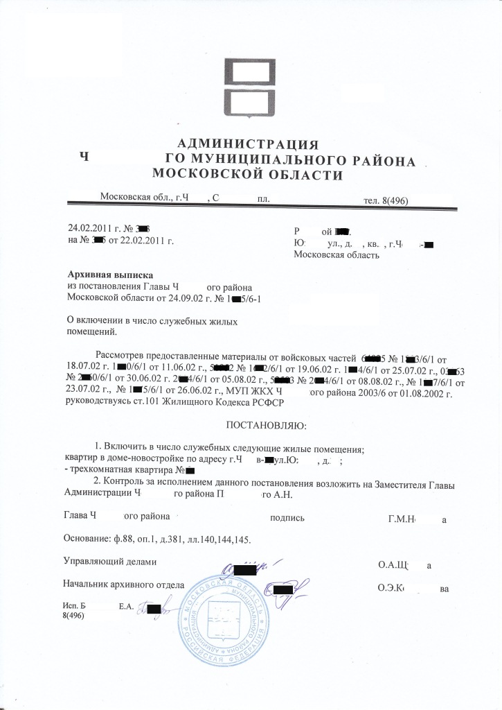 Знакомая ситуация. Ордер без полосы, а квартира отнесена к служебному жилому фонду решением администрации муниципального района. Как у нас. Для интереса выкладываю сканированные копии документов. Если смотреть по числам в/ч подала документы для заслужебливания жилого помещения в адм. муниципального района тремя пакетами, от 26.06.02г., 23.07.02г., 08.08.02г. Постановлением администрации муниципального района от 24.09.02г. статус служебного жилья установлен. Об этом свидетельствует выписка. При этом ордер от 18.11.02г. выданный на основании решения жил. комиссии в/ч от 28.08.02г.на квартиру ПЕНСИОНЕРУ в/ч (моему отцу) не служебный. Договор от 18.11.02г. тоже не служебный (его не выкладываю, но это так). И справку дают в в/ч, что квартира не служебнаяШайтан писал(а):