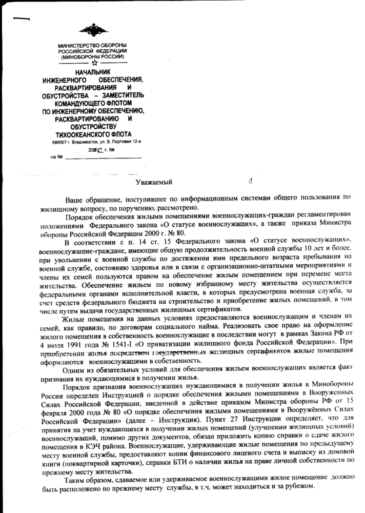 Ответ ТУТ - О предоставлении жилых помещений (Пр. МО РФ 2010 г. № 1280)