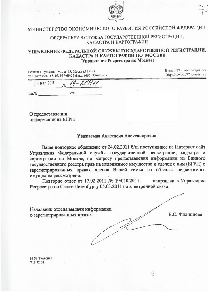 У меня на неоднократных ответах из МСК стоит исполнитель - Ткаченко И.М. (495) 710 32 68Посмотрите пожалуйста у кого есть ответы из г.Москва письменные, может там внизу странички след непосредственного исполнителя оставлен в виде телефончика?