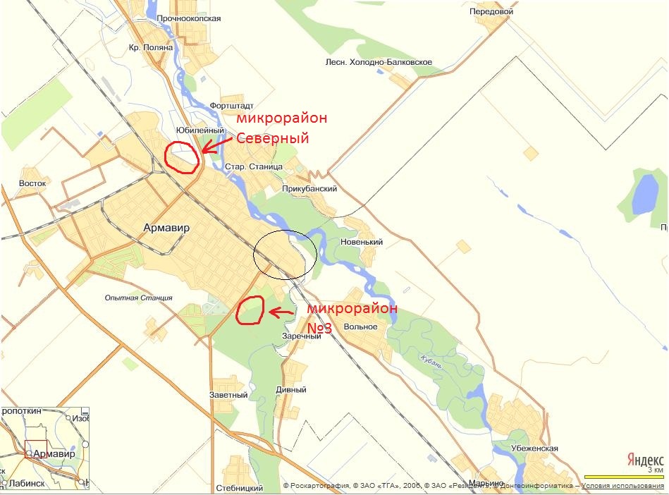 Общался на эту тему с замполитом местного авиаполка. Построили микрорайон, дома из готовых блоков (не знаю, как это правильно называется), их порядка 10. Проект аналогичен краснодарским на Карякина, Репина, Аверкиева, Зиповской. Ввиду того, что средняя цена 1 кв.м порядка 23 000 руб, а МО платило 30 000 - отделка несколько лучше, чем в Краснодаре: хорошие межкомнатные двери, ламинат, туалет и ванная в кафеле. Примерное место микрорайона на картинке (видел с самолета, не обратил внимания - с южной стороны железки или с северной).Уважаемые админы. Искал инфу по Армавиру долго. Не нахожу. Вообще есть или нет? Подскажите пожалуйста. Вроде домов там понастроили много . К нам в гарнизон пришло много уведомлений. За не в тему прошу прощения.