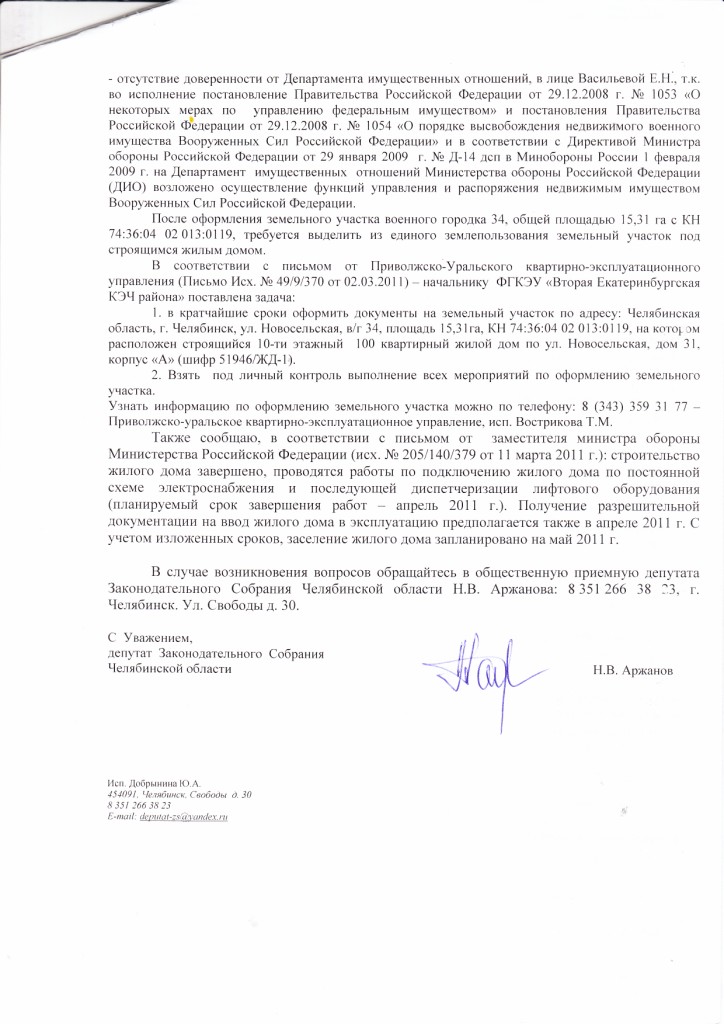 Итак, получен ответ от ДЕПУТАТА ЗАКОНОДАТЕЛЬНОГО СОБРАНИЯ ЧЕЛЯБИНСКОЙ ОБЛАСТИ Н.В. Аржанова, и по просьбе сослуживцев публикую этот ответ. Пожалуйста, знакомьтесь: