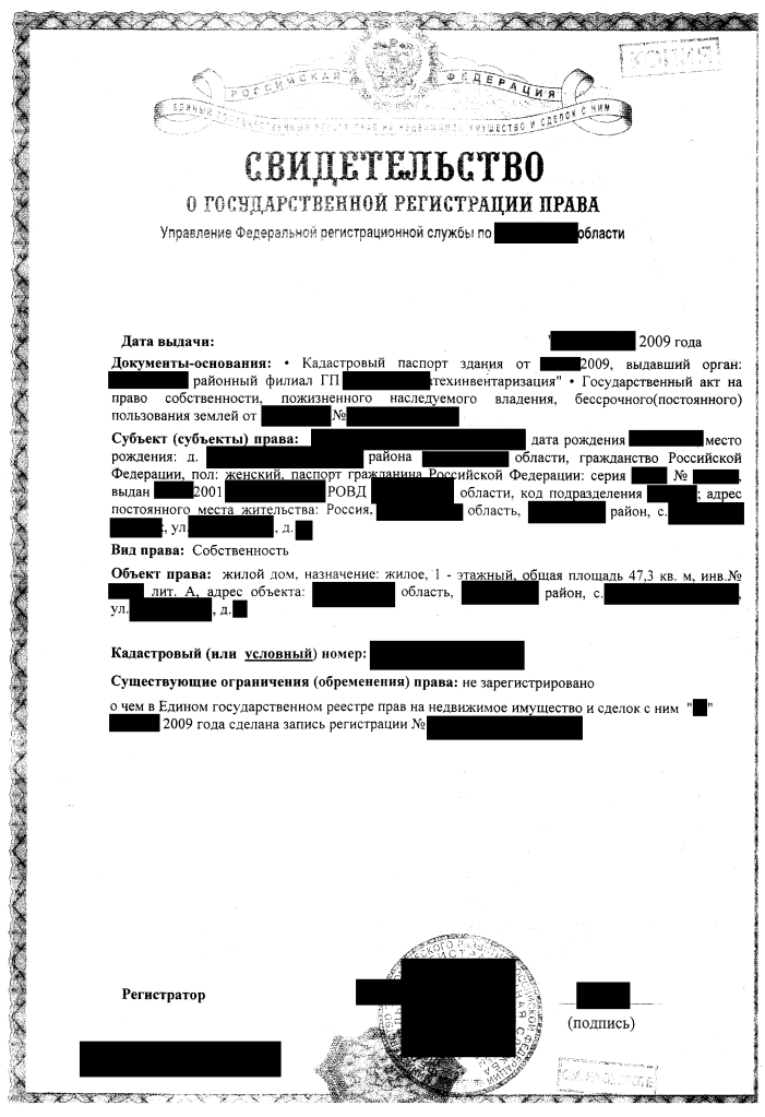 Может кому любопытно, как должно выглядеть Свидетельство о госрегистрации права на частный дом... вот добыл на тещино строение для представления в Департамент жилищного обеспечения МО РФ и подтверждения факта отсутствия собственности у супруги по прежнему месту жительства, в порядке дополнительных материалов к перечню 1280-10 по причине таких требований в РУЖО...