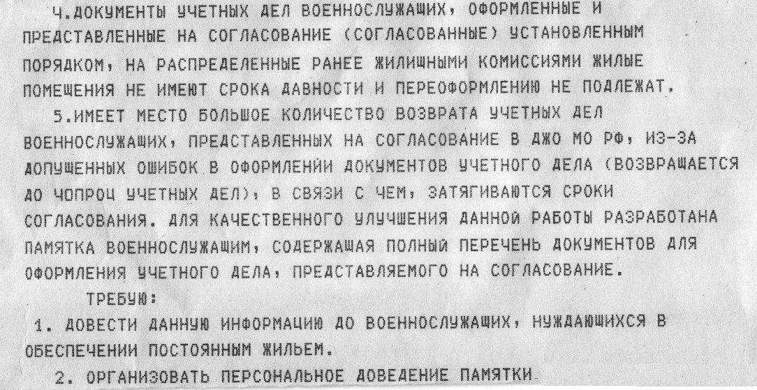 Уважаемая Анна!!! На самом деле всё будет так. После рассмотрения документов в окружном РУЖО и принятии решения о предоставлении распределённого жилого помещение, даже при наличии замечани (но незначительных, не приводящих к снятию военнослужащих с учета нуждающихся в жилых помещениях) и допустимых к устранению военнослужащими в месячный срок), выписка с проектом ДСН передаётся в местный отдел РУЖО. Учитывая, что такие отделы создаются на несколько субъектов допускаю, что Ваш отдел находится во Владике. Выявленные замечания предъявляются счастливому распределенцу жилья для цели их устранения. Не надо забывать, что решение имеет срок службы - 2 месяца "Решения о предоставлении жилых помещений принимаются уполномоченным органом не позднее чем через десять рабочих дней со дня получения от военнослужащих документов, указанных в пункте 13 настоящей Инструкции, при отсутствии оснований для снятия военнослужащих с учета нуждающихся в жилых помещениях и подлежат реализации в срок не более чем два месяца с даты их принятия." (п.16 ПМО 1280)"
