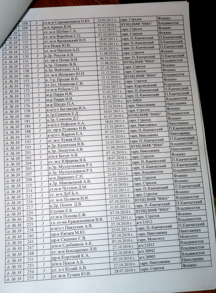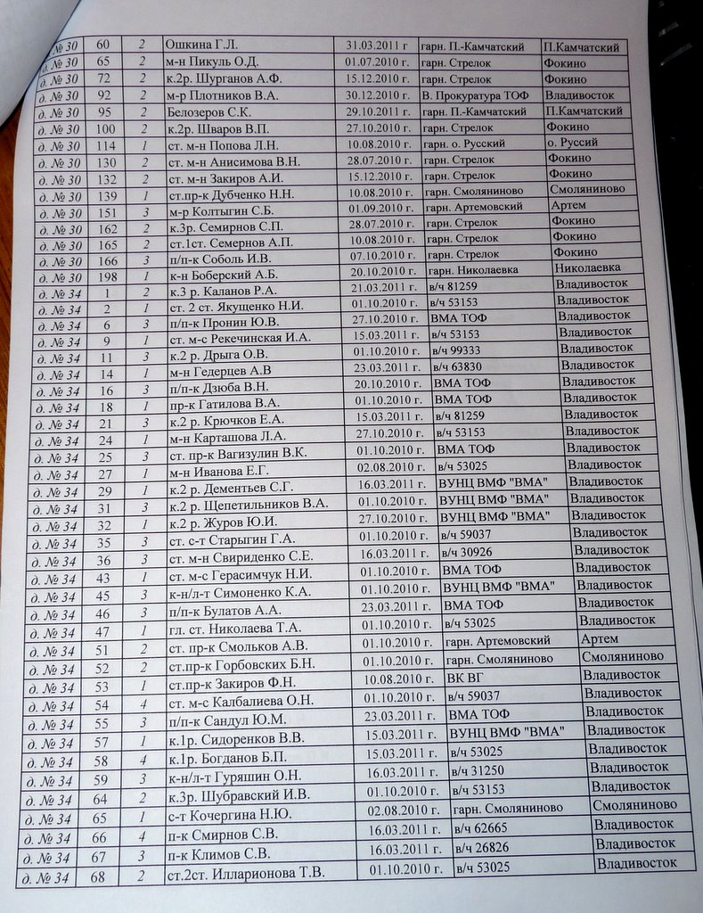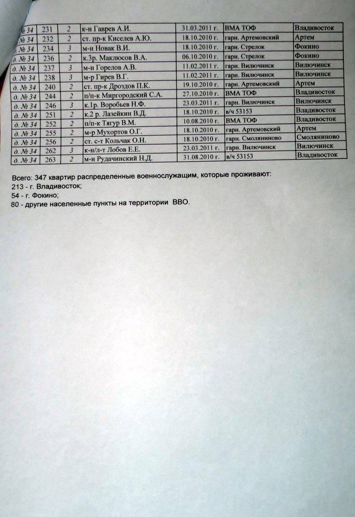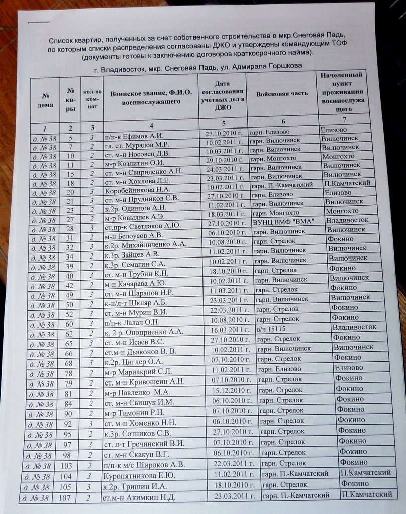 #2383Сегодня 4.05.2011 в ДОФ'е состоялась рабочая встреча с представителями ВРЖД. Тема встречи: "Заселение СП ". Предлагается желающим (акцентирую, что предлагается и только желающим) въехать по временным ДСН. Въезд возможен через 2 недели при условии подключения воды и канализации. Увольнять из ВС до заключения настоящих ДСН не собираются. Через 2 часа обработаю видео и выложу полный видео отчёт в контакте, Google, шаре Альянса и шаре Билайна. Тогда и появиться темы для разговора. Пока выкладываю списки тех, у кого документы готовы к подобным дедам. К сожалению не удалось добыть списки тех, чьи документы уже прибыли в ВРЖД