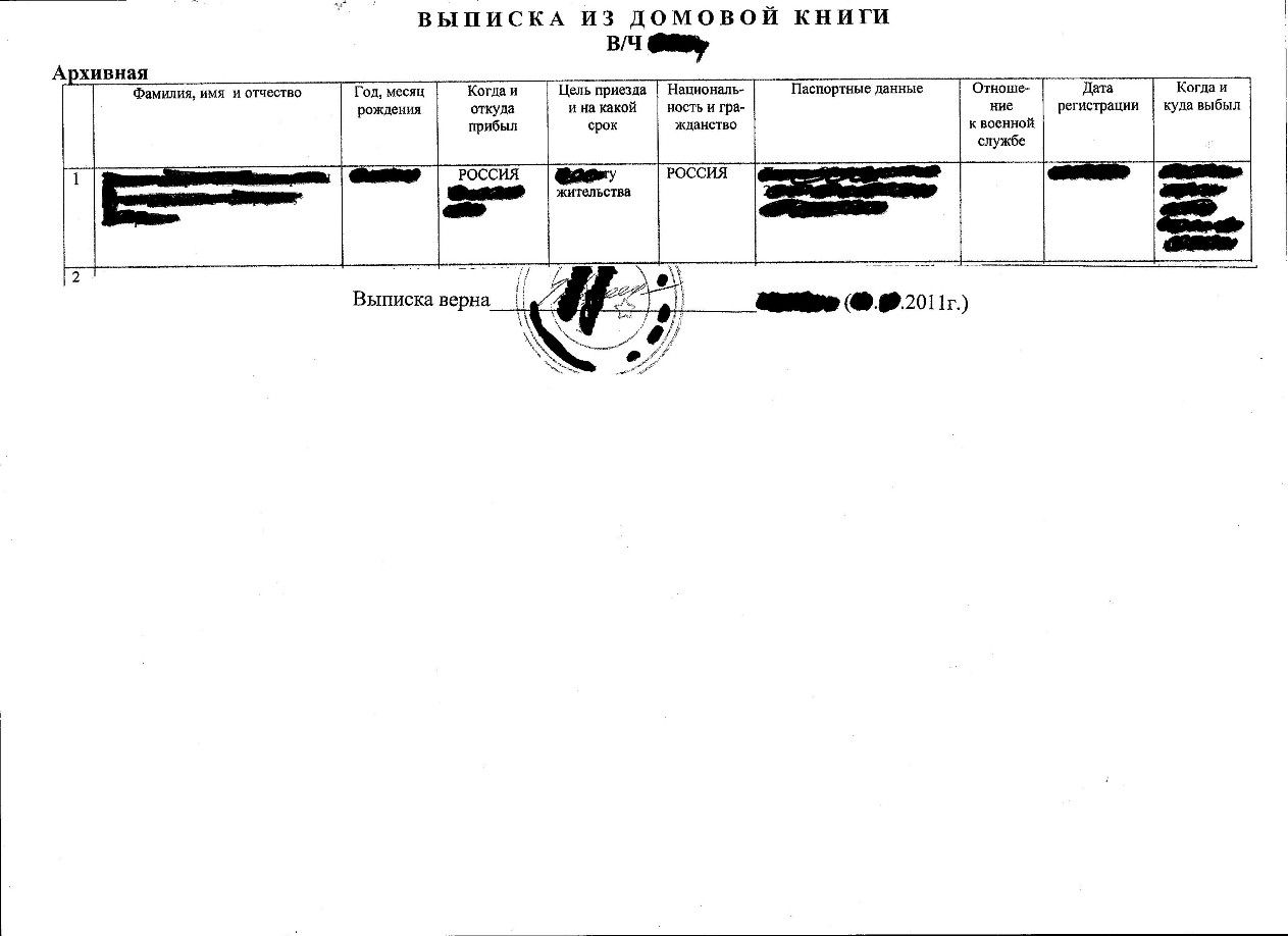Подскажите, что должно быть в выписке из домовой книги о регистрации при в/части, а ещё лучше может у кого-то есть образец.