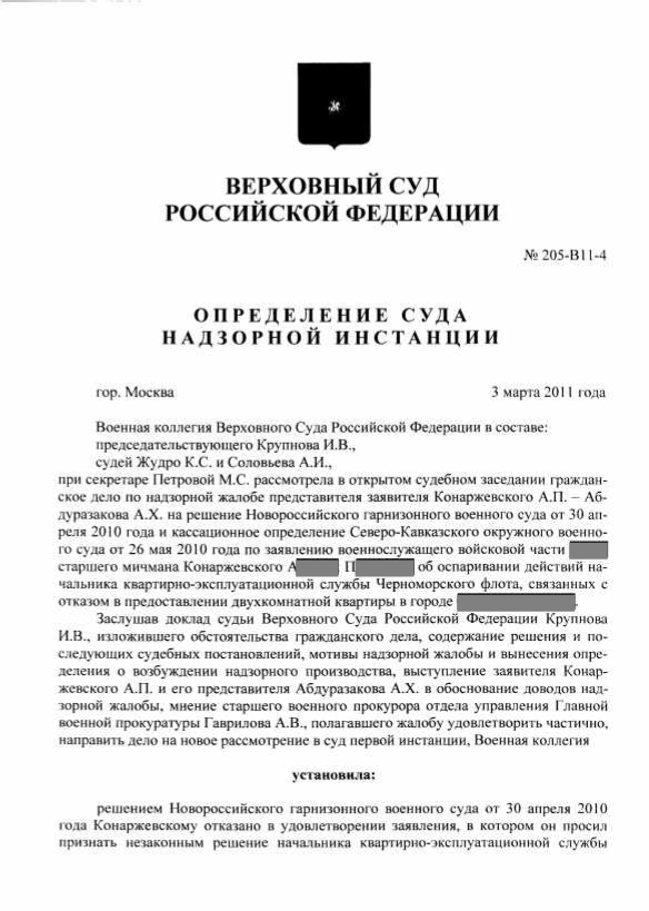 Офицер,27 календарных лет выслуги.В 1994 году от МО РФ получил 2-х комн.квартиру на состав семьи из 3-х чел(я,жена,дочь)общ.пл.52 кв.м.В 1998 году родился сын.В 2000 г. жилкомиссия части признала меня нуждающимся в УЖУ(хотя метража на 4-х хватало,и как потом выяснилось незаконно).В 2005г.(после вступления в силу нового ЖК РФ) я развелся с женой.Принял кое-какие меры для выдела своей доли и сдачи ее КЭЧ(из того, что могу доказать документально,есть только решение суда с отказом на раздел лицевого счета;и бумага от зам. командующего округом по строительству и расквартированию с согласованием нач.КЭУ на выделение мне однокомнатной квартиры,остальное-слова)После того как не смог ничего отсудить,выписался(в мае 2006г) из спорной квартиры и прописался при части.Решением жилкомиссии части остался на очереди один,т.к.все члены моей бывшей семьи оказались обеспечены по нормам за мой счет.В 2006г.мне распределили 1-комн. квартиру.Однако при оформлении документов,представители КЭЧ района заявили, что стоял в очереди я незаконно,и вообще выписавшись из квартиры я ухудшил свои жил,условия(откровенно вымогали взятку,а я будучи уверенным в своей правоте-не поддался и вошел с ними в конфронтацию,все юристы,к которым обращался, говорили,что мое дело правое).Тема была еще новая и каково было мое удивление,когда суд первой инстанции признал за мной это ухудшение и меня лишили той квартиры.Я прошел все круги ада(до военной коллегии ВС).Оставили без изменения....