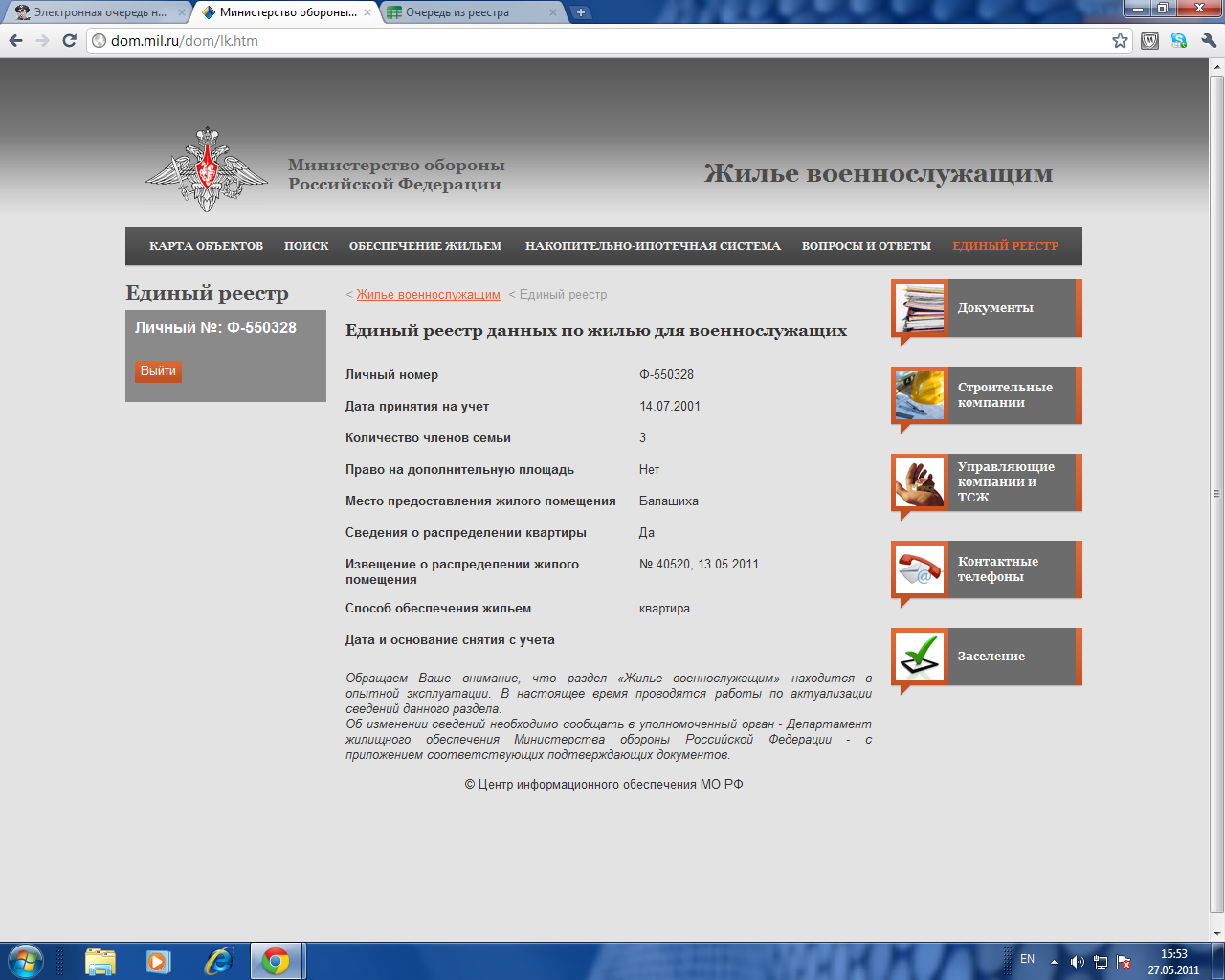 Спасибо за ответ! В очереди записался. Насчет 10 человек слабо. Я один остался с 25 годами выслуги в армии из одноклассников. И все же - на сайте МО сегодня информация об извещении появилась???
