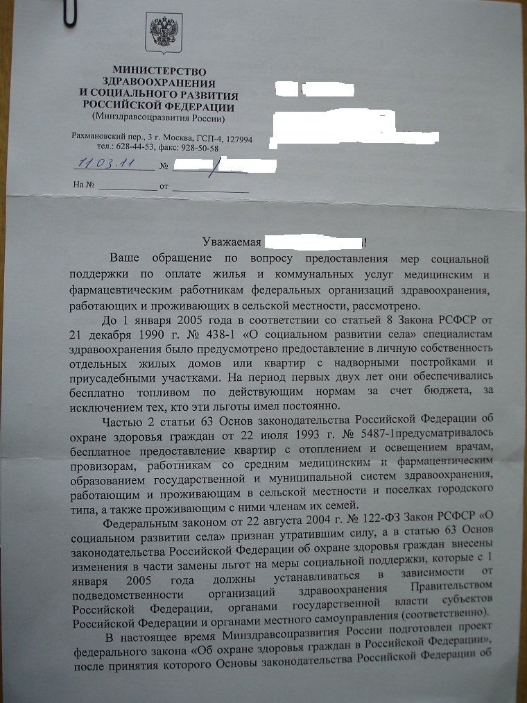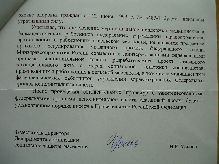 А вот ответ ведомства, которое обязано было разработать проект для нашего Правительства РФ по поводу объёма и порядка предоставления льгот медицинским работникам федеральных учреждений здравоохранения до марта 2005 года