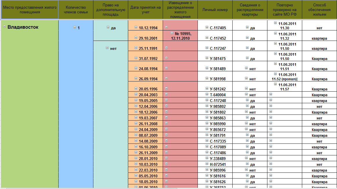 Вот отдельные выписки из Единого реестра на жилье военнослужащих по Владивостоку, если хотите полную информацию Вам сюда https://spreadsheets.google.com/spreads ... 6MQ#gid=52