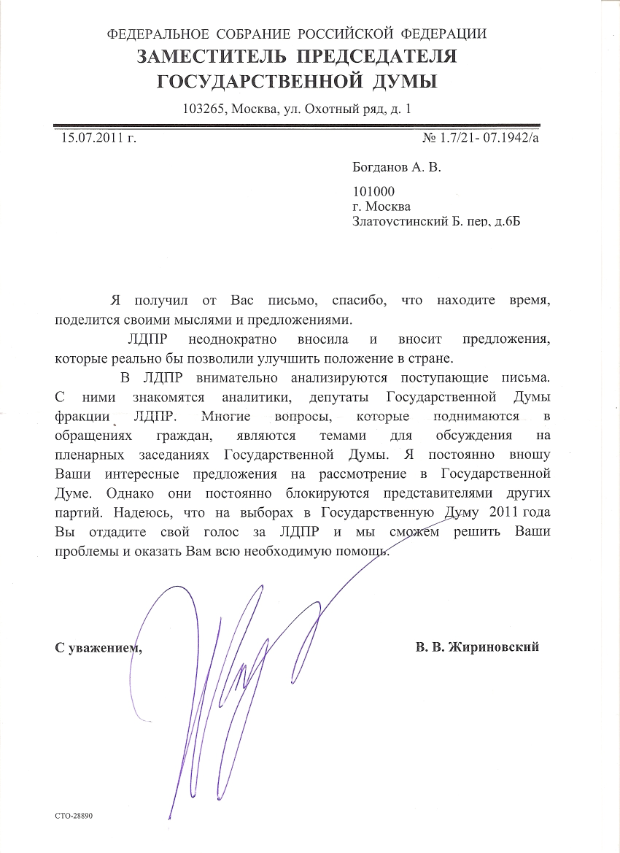 #1397Мне 08 АВГУСТА 2011 от Председателя Комитета Совета Федерации по обороне и безопасности В.А.Озерова по почте на домашний адрес пришел ответ от 15.07.2011г. №3.5.-35/1166 следующего содержания: