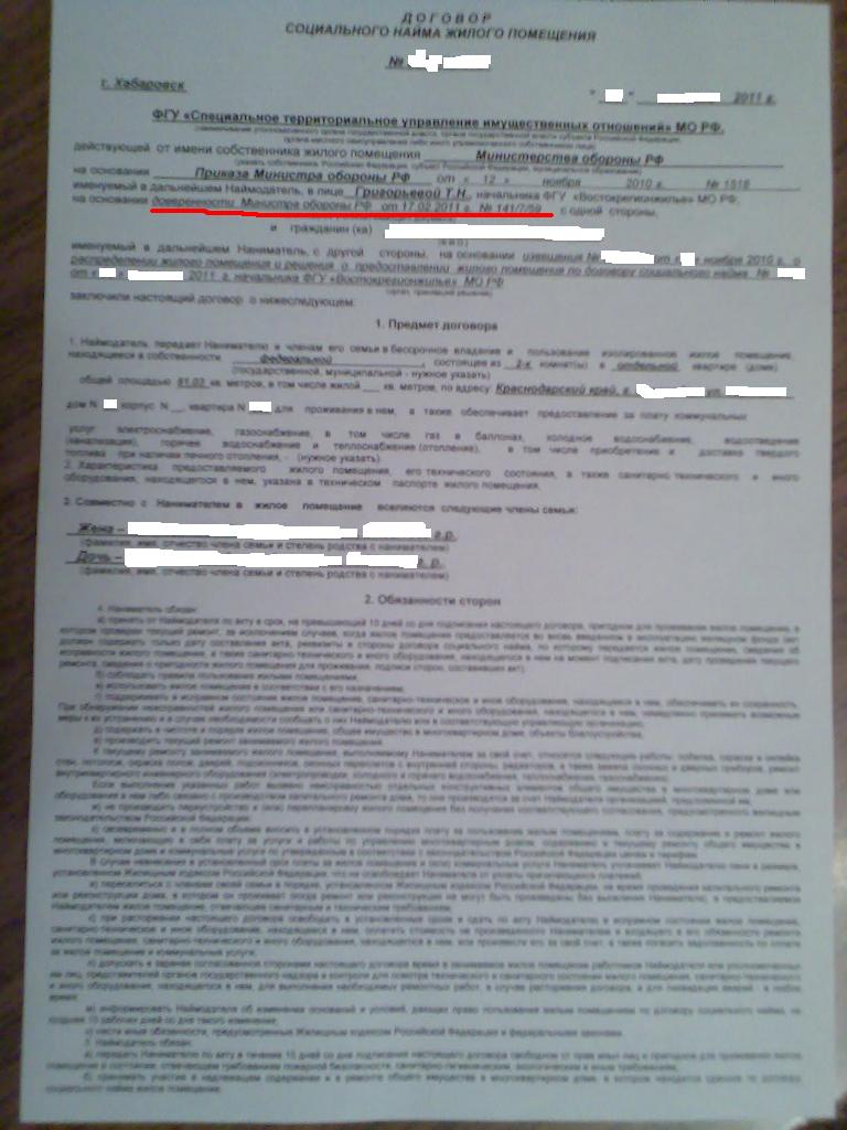 #1274Уважаемый Sega-38, вы пишете: "В ДСН должно быть написано так (лицевая сторона): .... на основании доверенности Министра обороны РФ от 17.02.2011г. № 141/7/59 , а не (как девка раньше многим выписывала) по доверенности Министра обороны РФ от 11.05.2011г. № 207/243д !!!!!!". А у меня именно так в ДСН и есть № 207/243д. И как не странно этот номер совпадает с копией доверенности от т.Сердюкова выданной гр.Григорьевой Т.Н. на право заключать ДСН. А этот номер (141/7/59 от 17.02.2011г.) откуда взялся?