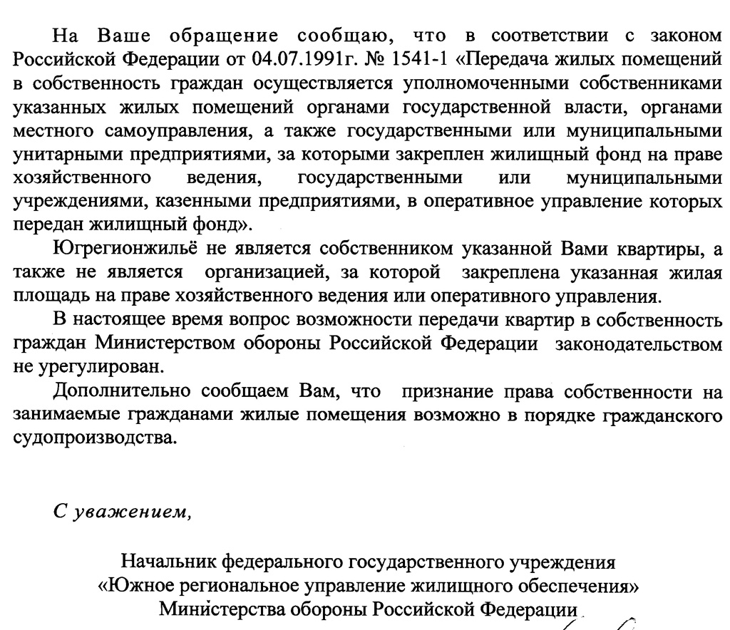 #1318Все правильно, но они даже не вынесли решение (в течении 3-х рабочих дней), как мне дать это жильё! ДСН я не подписывал и буду подавать в суд, а там посмотрим! Не знаю как отреагирует на это суд, но попробовать я думаю стоит!из Вашего ответа видно, что они ссылаются на закон о приватизации а не на 512 ПП, соответственно в собственность через приватизацию.....о передачи квартиры в собственность бесплатно