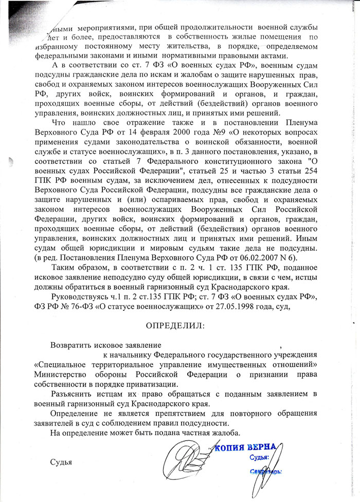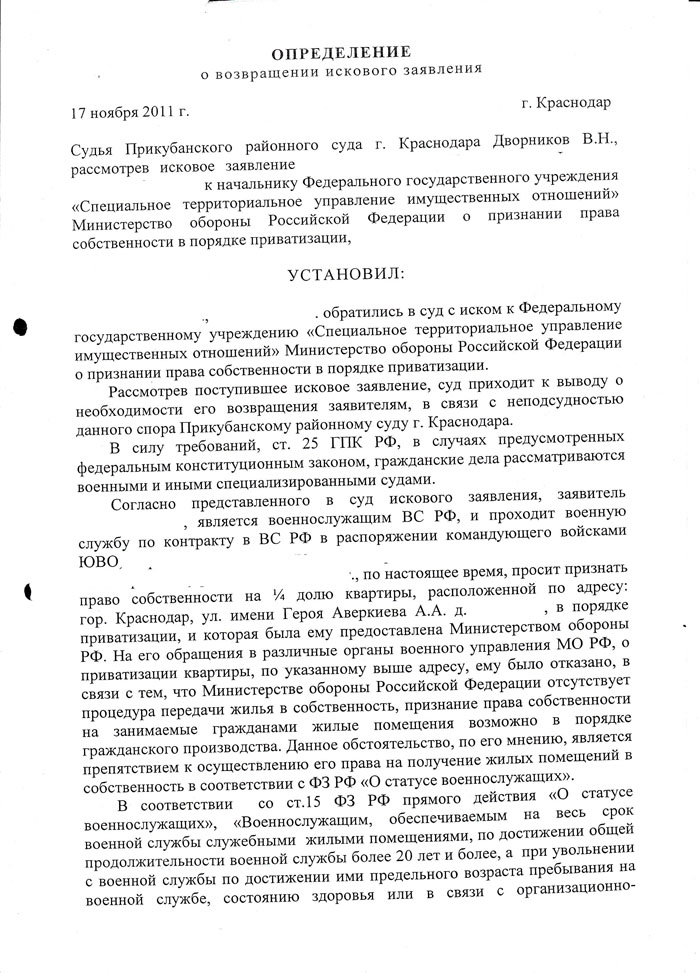 25 ноября 2011 года по почте нами получено определение от 17 ноября 2011 г. судьи Прикубанского районного суда города Краснодара - о возвращении искового заявления, ввиду подачи иска по ненадлежащей подсудности, на основании ст. 25 ГПК РФ, по причине того, что квартира, являющаяся предметом иска, предоставлена мне, -, как военнослужащему МО РФ, Минобороны РФ по договору найма жилого помещения, а значит заявление я, как военнослужащий оспаривающий решение, действие (бездействие) органа военного управления или командира (начальника) воинской части, должен подавать в военный суд (ст. 254 ГПК РФ).