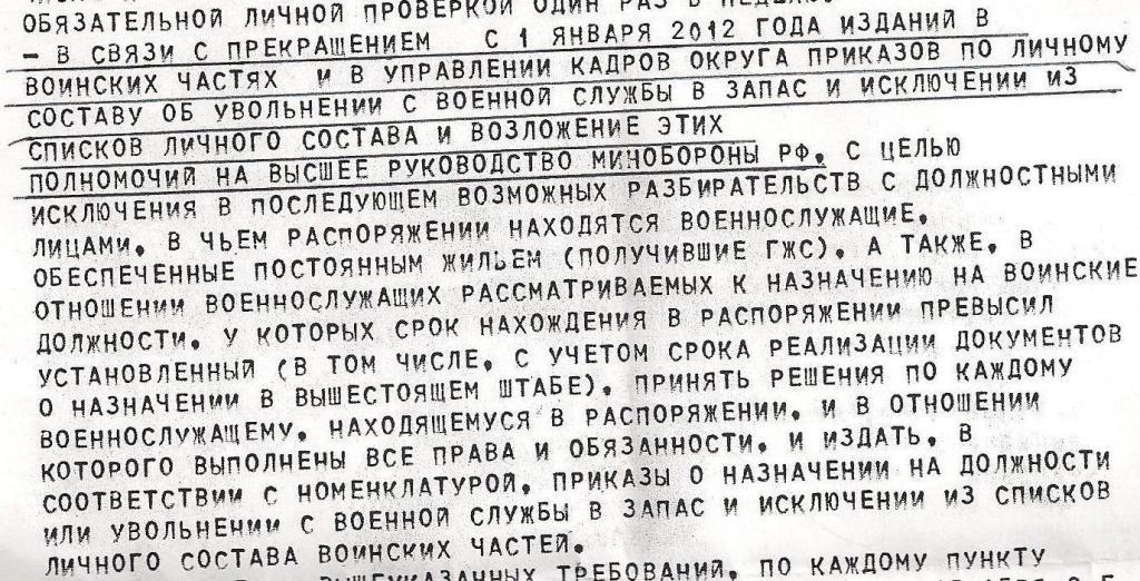 #9998Вот и телеграмма только с приказом об исключении, слишком загнули.приказы об исключении из списков части военнослужащего будет издавать ГУК (ИМХО)Сегодня прочитал армейскую телегу касающиеся распоряженцам. Один из пунктов была, что с 1.01.2012 г. с командиров в/ч снимается функция исключение из списков части военнослужащего. Кто нибудь слышал о таком приказе? Вечером попробую скан выложить.