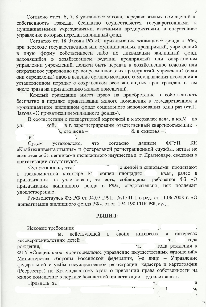 Договор социального найма с Вами заключен? Тогда хоть и отказываетесь от участия в приватизации, а в суд подавать Вам.подскажите.ХОЧУ приватизировать квартиру полученную по дсн, состав семьи: я,супруга,сын-1,5года.Но хотим приватизировать на жену и сына,т.к я участвовал в приватизации.справки и ответы из СТУДИО и РУЖО собрали, тех. и кадастровый паспорт заказали. Не могу понять кто должен подавать в суд, я- но я отказываюсь от приватизации ? и какая особенность в заявлении в суд, как правильно написать ? Заранее спасибо за помощь !!!