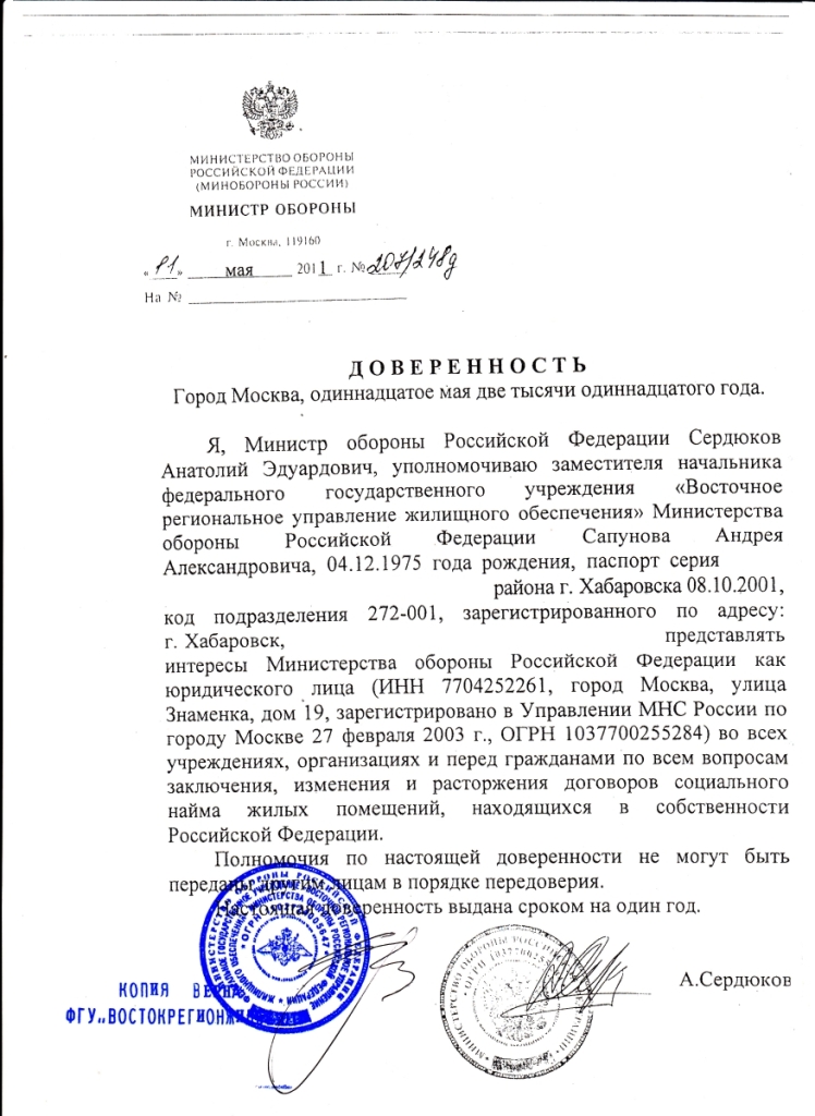 на Сапунова А. А. имеется доверенность от имени МОРФ Сердюкова, который не является наймодателем... ждите проблемы при вселении и приватизации с такими ДСН