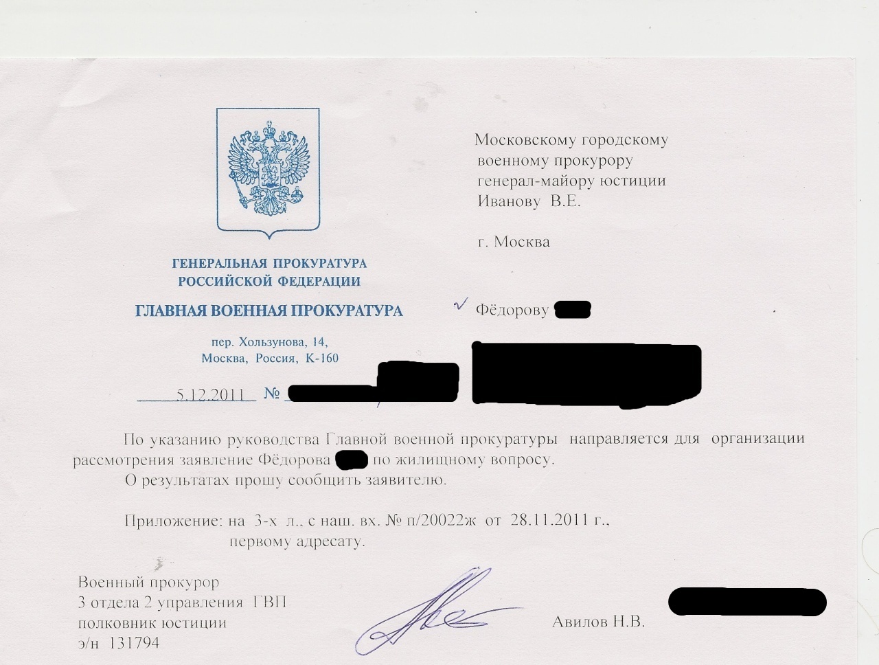 Да, забыла еще написать, что Генеральный прокурор отправил наш вопрос все в ту же Московскую военную прокуратуру. Мне перед праздниками пришло письмо из Генеральной уже.