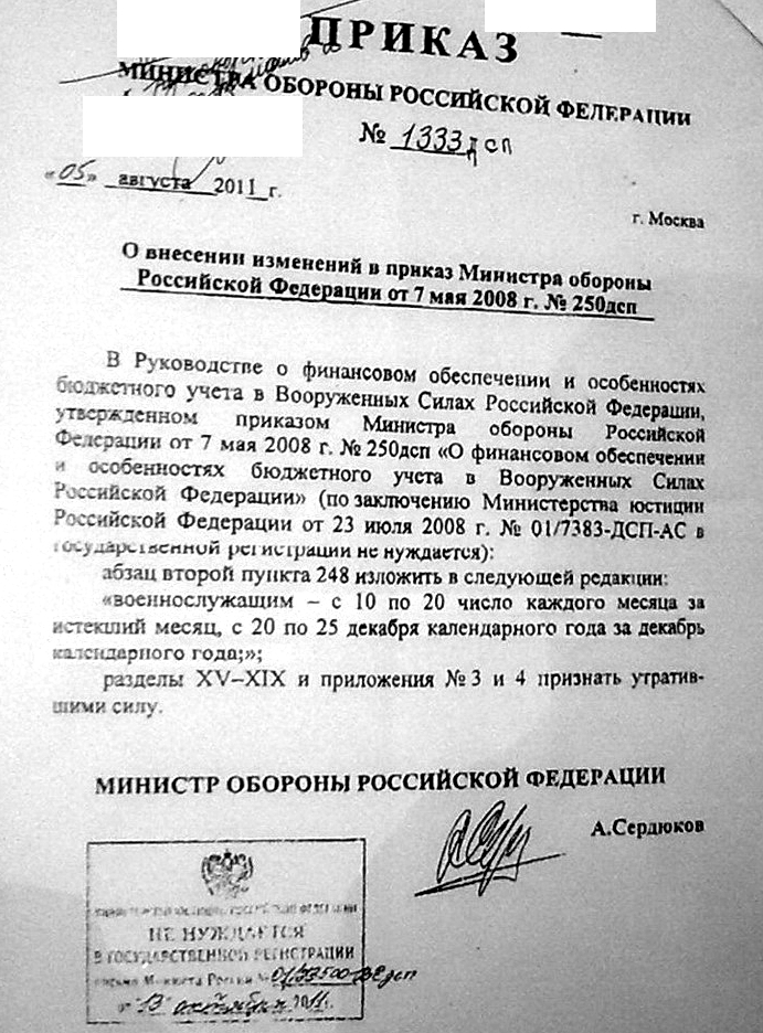 Приказ МО от 5 августа 2011г. №1333-ДСП.А где-нибудь официально доводили, что сроки выплаты ДД переносятся?