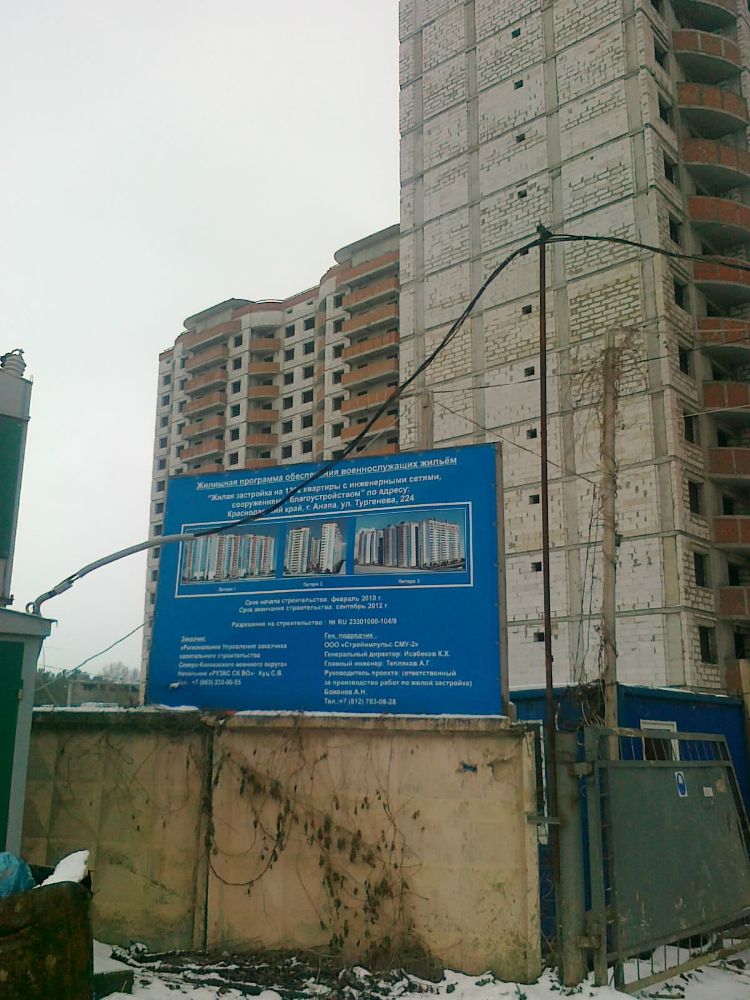 Хорошие фото с Тургенева, 224 Вы разместили. Только вопрос: кто нам там распределит квартиры???? В этих домах квартиры также могут быть распределены как по Крылова 13 и Межсанаторном 20 и люди также как мы их ждут. А если и не распределены, то на каком основании нам их распределят сейчас? Как я понял, большинству из нас Анапа "упала как манна небесная"-на Анапу мы и не претендовали. Если МО расторгло контракт по Крылова 13, то если и предложат квартиру, то совсем (совсем) не факт, что В Анапе, в Краснодарском крае есть и другие населенные пункты. Лично мне еще не сообщали, чтобы я переписывал распорт. Информацию о расторжении контракта по Крылова 13 тоже нет. И что я сейчас заявлю в РУЖО- "дайте другую квартиру, но только в Анапе, хотя бы на Тургенева, 224"?.