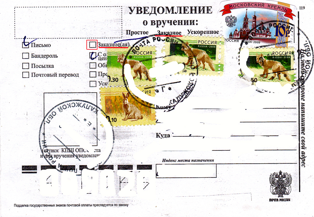 Вот, для Вас сделал - о чем Вам советовали подчеркнул и выделил красным цветом.Для этого при отправке в уведомлении ставите галочку в квадратике "Заказное"