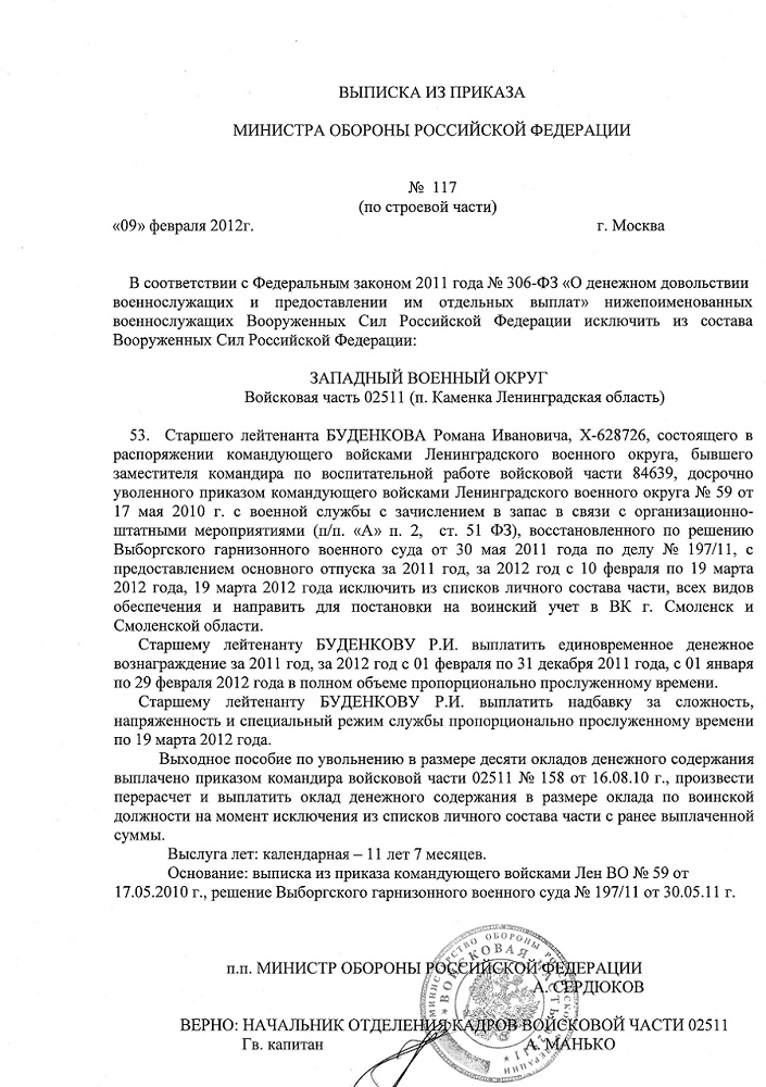 vesna 777 : Еще раз довожу до особо одаренных.... В случае если Вы уволены, то в графе 12 послужного списка личного дела, и в п.10. Денежного аттестата , будет указано количество окладов денежного содержания и в какой сумме выплачено единовременное пособие при увольнении с военной службы . В случае восстановления на военной службе , ваше личное дело и денежный аттестат будут отозваны из военкомата в войсковую часть , и при последующем вашем увольнении УФОлоги будут учитывать ранее выплаченное пособие , да и кадровик при составлении проекта приказа также не упустит ранее сделанной записи,и вам единовременное пособие выплатят исходя из общей выслуги на день последнего увольнения( т.е. всего лишь доплатят разницу между выплаченным и возникшем праве на единовременное пособие на момент увольнения …) В моем случае, я не был исключен из списков части, и выплата мне была произведена в количестве 20+1 ОДС в декабре 2011 года, а так как исключали из списков части в 2012 году ,то возникло право на получение мною 7+1 ОДС , исходя из этого и доплатили разницу.... Вопрос закрыт!!!