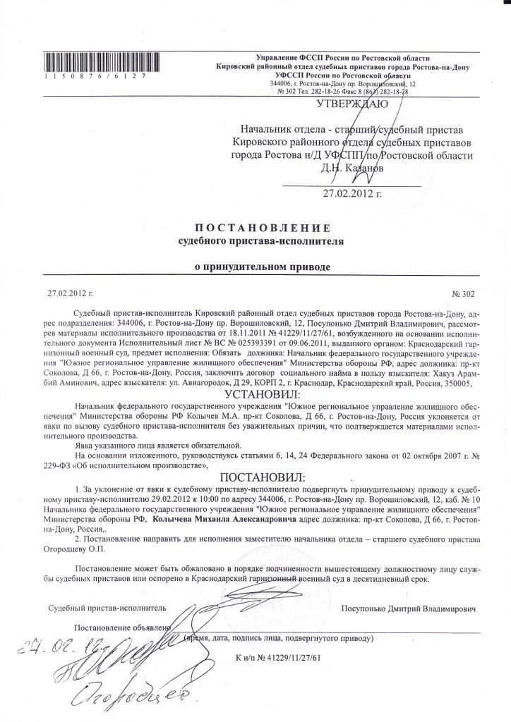 Пример: На руках решение обязать ДЖО предоставить мне хату во внеочередном порядке с учетом права на доп.квадраты. Решение уже года как два у меня на руках было... Обращался и к судебным приставам и Презику писал, прокуратуру, в общем писал везде. И вдруг дали хату, но меньше чем нужно, я плюнул на все, не особо надеясь на успех, написал отказ и приложил свое решение суда, отправил все факсом, и О, АЛЛИЛУЯ, не прошло и недели как мне дали уже двушку