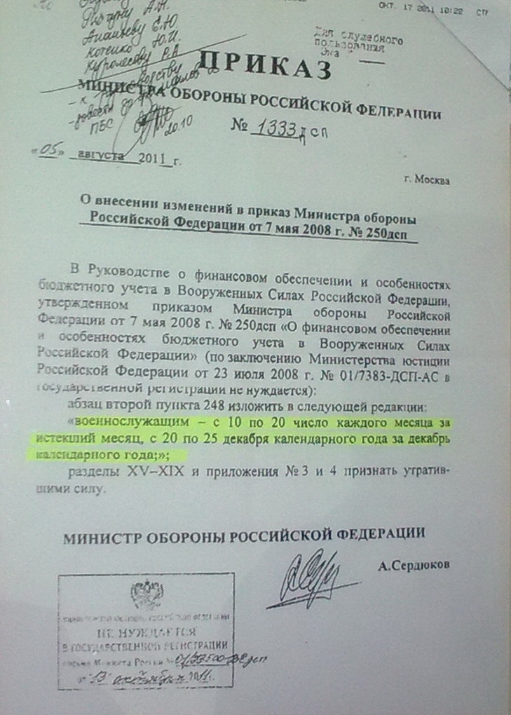 читайте пост 1632Кто-нибудь слышал про приказ № 250 (ДСП) о сроках выплаты ДД с 10 по 20 следующего месяца?