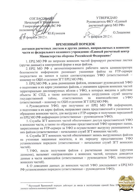 Временный порядок доставки расчетных листков и других данных, направленных в воинские части из федерального казенного учреждения "Единый расчетный центр Министерства обороны Российской Федерации"