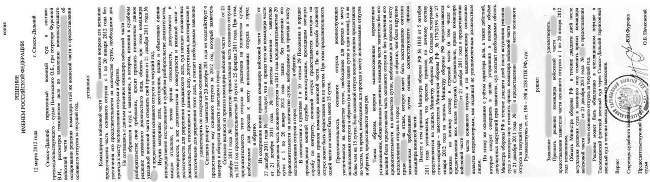 Это, конечно, хорошо. Но вот правовое обоснование выводов суда по делу в части неправомерности издания командиром воинской части приказа о предоставлении основного отпуска все же оставляет сомнения. ИМХО.