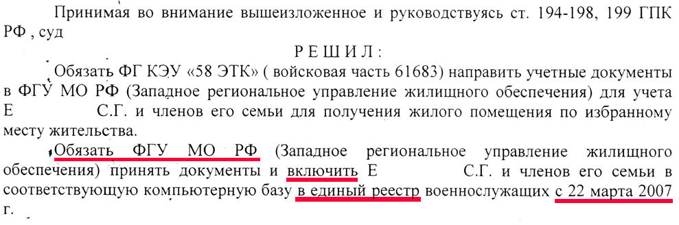 это означает,что судебные решения уже есть,просто в конце 2010 я собрал доки по 1280 и мне сказали по месту службы Вы обеспечены служебным жильем по норме