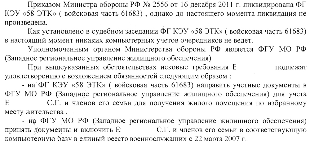 Мы с Вами жители одного ЗВГ - Козельск-5. И вот мой друг, уволенный в 2007 г. по "В" и выкинутый из базы "Учет", как обеспеченый в 2003 г. "служебкой" на Гвардейской по норме, и закл. первый контр. до 98 - при формировании реестра (это когда наш доблестный жилотдел 58 ЭТК формировал таблицы из 39-41 стл. для создания Реестра ДЖО) не был в них включен. Я обратился в суд.... Решение есть: обязать передать КЭЧ (и пусть они хоть и исходились, что уже их нет) данные друга в РУЖО, а РУЖО включить в Реестр с 2007 года. Надо в Козельске открывать свою "юр. контору" по оказанию помощи ;) Если в апелляции устоим.