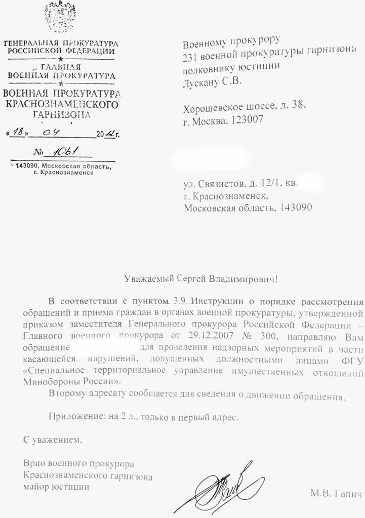 А он перешлёт Роженко - ВП КЗЖалоба перенаправлена Военному прокурору РВСН Самусеву В.Н.