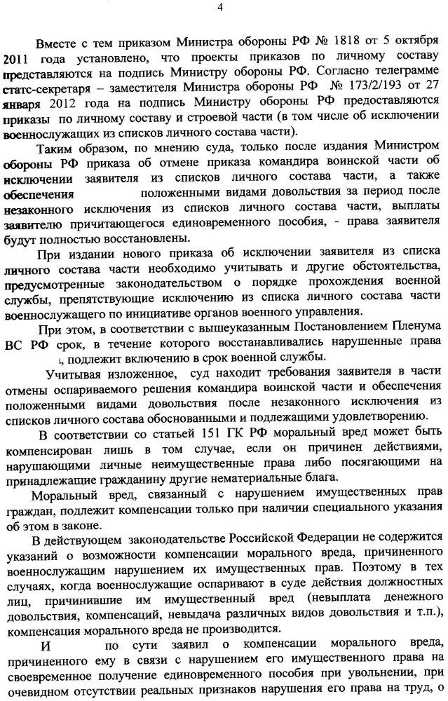 При этом приказ Министра обороны РФ от 5 октября 2011 года №1818, изменивший порядок исключения военнослужащих из списков личного состава воинской части, на который ссылается заявитель, официально опубликован не был и, как видно из приобщённой к делу копии телеграммы командующего войсками Западного военного округа от 23 января 2012 года, был направлен для исполнения в войсковые части и органы военного управления лишь в 20-х числах января 2012 года. Поэтому суд полагает, что издание Министром обороны вышеуказанного приказа в данном случае не ставит под сомнение полномочия командира войсковой части № по исключению заявителя из списков личного состава воинской части, поскольку соответствующий приказ был издан ответчиком ещё в декабре 2011 года.