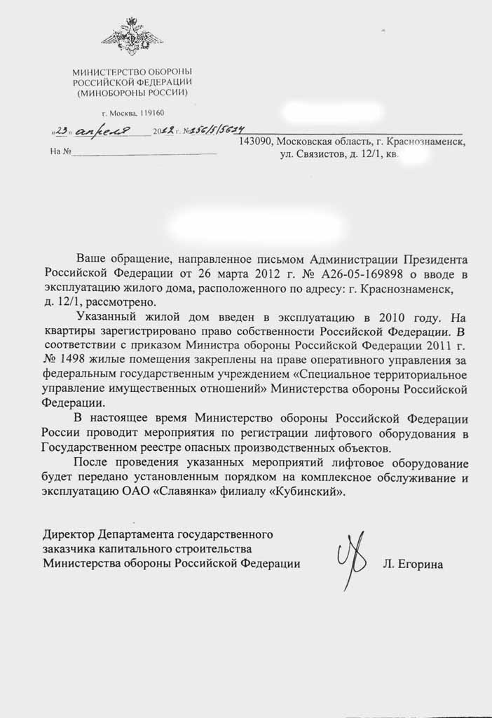 Вот поясните мне. Как можно передать"лифтовое оборудование установленным порядком на комплексное обслуживание и эксплуатацию ОАО «Славянка» филиалу «Кубинский», если сами ДОМА НЕ ПЕРЕДАНЫ другим департаментом МО РФ = ДИО = в эксплуатацию ОАО "Славянка"???