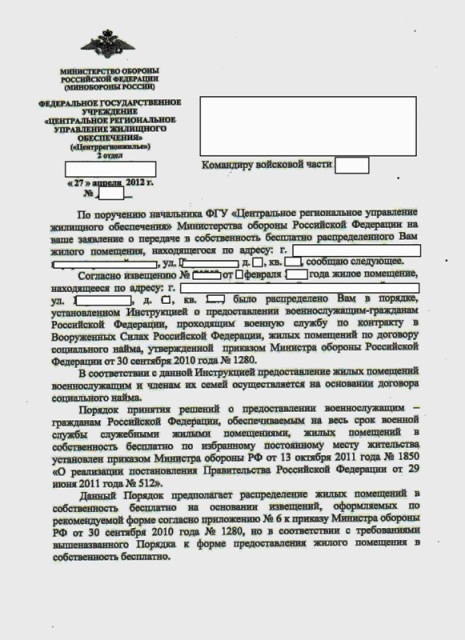 Я считаю, что нетА как Вы считаете, ссылка на то что что жилое помещение мне распределено согласно инструкции ПМО 1280 и извещение составлено согласно форме приведенной в приложении к ПМО1280, могут служить правомерным отказом в предоставлении мне жилья в собственность согласно ПМО1850