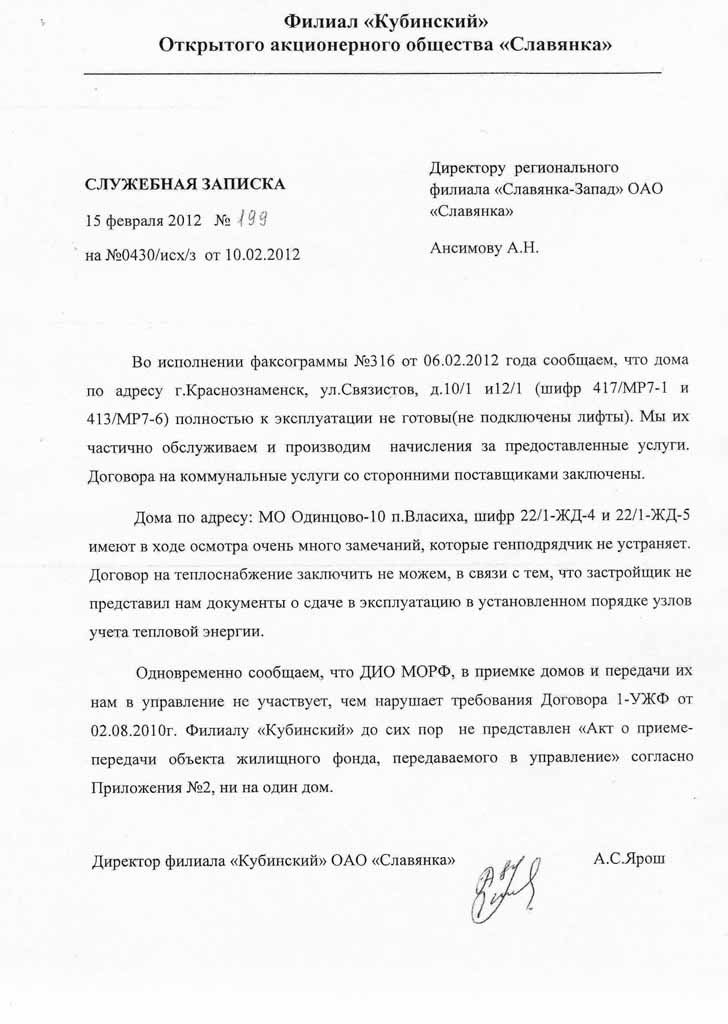 Давайте почитаем, что пишет Директор филиала «Кубинский» Открытого акционерного общества «Славянка» А.С.Ярош В СЛУЖЕБНОЙ ЗАПИСКЕ от 15 февраля 2012 № 199 на №0430/исх/з от 10.02.2012 Директору регионального филиала «Славянка-Запад» ОАО «Славянка» Ансимову А.Н.