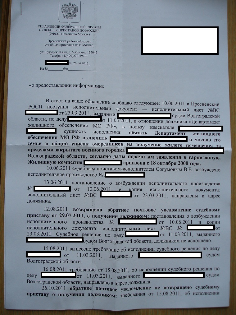 Вчера свершилось это - исполнено решение суда и ДСН я получил! Как я сужу по действиям приставов (меня отдельно "выделили") - если бы не написал сообщение о преступлении и не надо решать вопрос о возбуждении дела (неисполнение очевидно и прокуратура с надзором в вопросах сообщений о преступлениях не шутит), то всё бы валиком и двигалось. Имело значение и обращения (раньше описывал) в ГВП и уполномоченному президента в ЮФО.