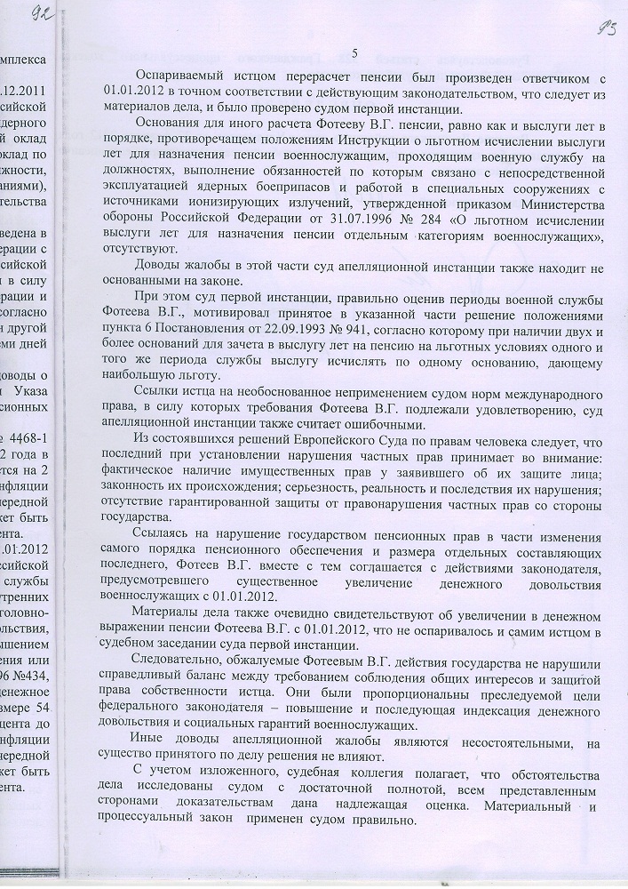 Прямого указания на придание этой норме обратной силы в Законе не содержится, равно как не содержится такой нормы в законе N 166-ФЗ от 15.12.2001 г. и законе №309-ФЗ. В соответствии с позицией Конституционного суда РФ, изложенной в Постановлении N 9-П от 23.04.2004 г. подлежит распространению и на Закон РФ от 12.02.1993 г. N 4468-I « 4.2. В силу статей 1 (часть 1), 4 (часть 2), 15 (части 1 и 4), 19 (часть 1), 76 (части 1 и 2) и пункта раздела второго "Заключительные и переходные положения" Конституции Российской Федерации структурирование системы федерального законодательства, по общему правилу, предполагает, что нормы, отменяющие или изменяющие определенные преимущества, компенсации и льготы, вносятся в текст того Федерального Закона, которым они были установлены. Ни в один Федеральный Закон, регулирующий пенсионное обеспечение военнослужащих, не было внесено прямых указаний на применение части 2 статьи 43 №4468-1 для пересмотра пенсий, назначенных до 01.01.2012г.