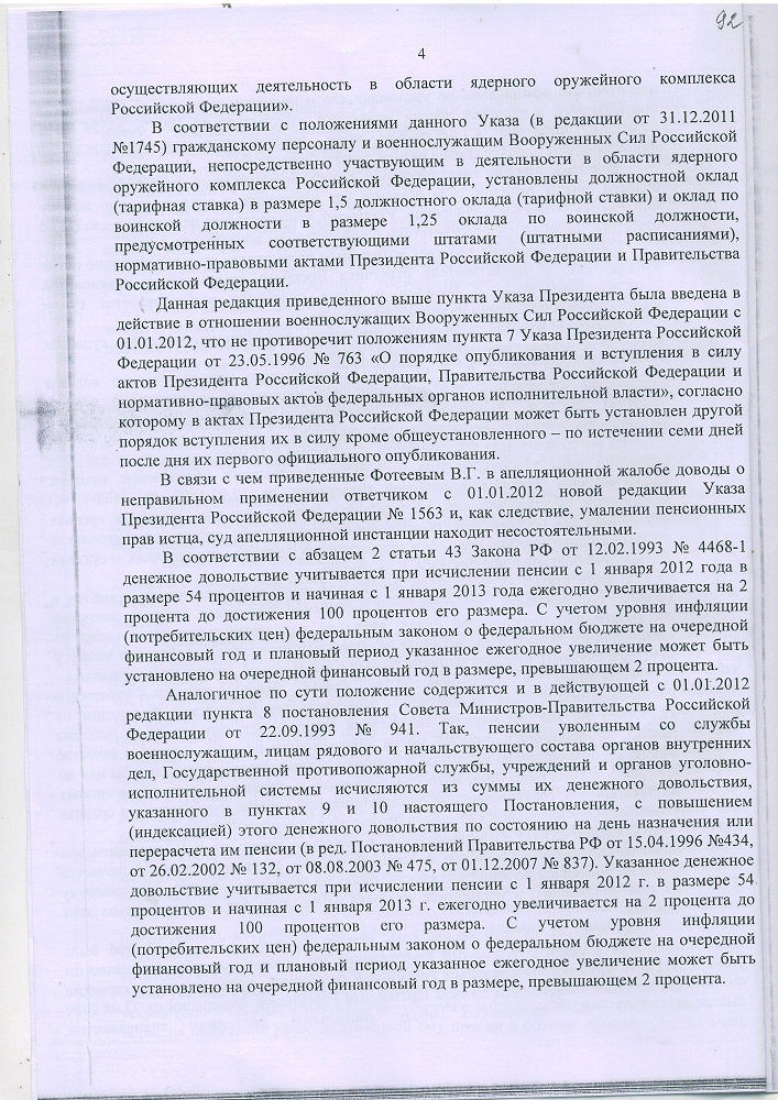 Прямого указания на придание этой норме обратной силы в Законе не содержится, равно как не содержится такой нормы в законе N 166-ФЗ от 15.12.2001 г. и законе №309-ФЗ. В соответствии с позицией Конституционного суда РФ, изложенной в Постановлении N 9-П от 23.04.2004 г. подлежит распространению и на Закон РФ от 12.02.1993 г. N 4468-I « 4.2. В силу статей 1 (часть 1), 4 (часть 2), 15 (части 1 и 4), 19 (часть 1), 76 (части 1 и 2) и пункта раздела второго "Заключительные и переходные положения" Конституции Российской Федерации структурирование системы федерального законодательства, по общему правилу, предполагает, что нормы, отменяющие или изменяющие определенные преимущества, компенсации и льготы, вносятся в текст того Федерального Закона, которым они были установлены. Ни в один Федеральный Закон, регулирующий пенсионное обеспечение военнослужащих, не было внесено прямых указаний на применение части 2 статьи 43 №4468-1 для пересмотра пенсий, назначенных до 01.01.2012г.