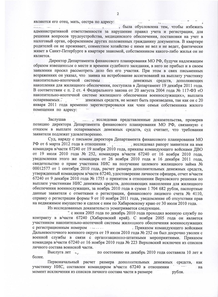Ныне, с сентября 2012 года офицер запаса, бывший участник НИС. Вступил по собственному желанию в августе 2005 после выпуска из вуза рапортом. В армии с 1 августа 1998 года, первый контракт 1999 год во время обучения. В июле 2011 года приобрел квартиру в питере за 2,7 млн. р. из расчета 2 млн кредит 700 накопилось.В сентябре 2012 по ОШМ уволен. В соответствии с 77 приказом подал необходимые документы для доп выплаты. В ноябре на счет в сб. банке пришли деньги в размере 1212тыс. руб. Заплатив ими осталось 790тыс кредита. На момент увольнения выслуга составила 14 лет 1 месяц.