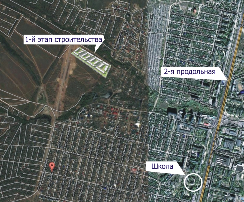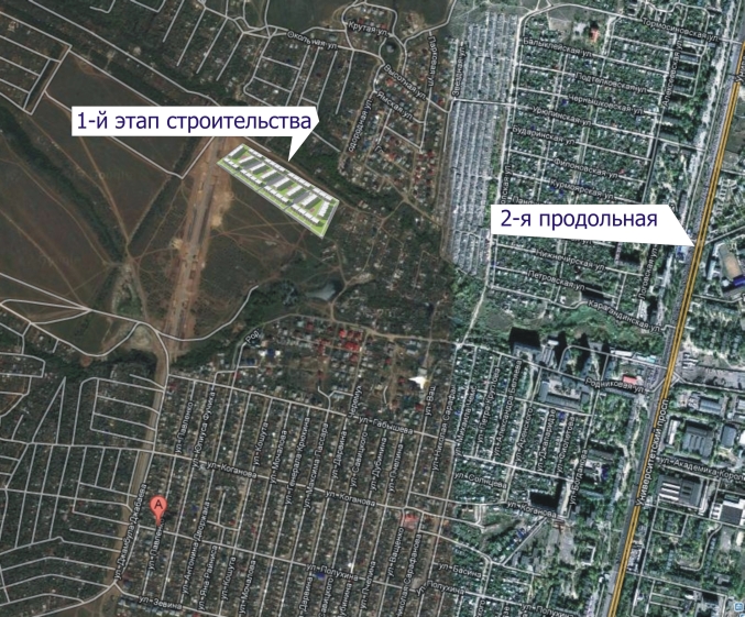 от обозначения влево до асфальтовой дороги и по асфальту вверх до тупика. Вот там вправо вниз и строят первую очередь.