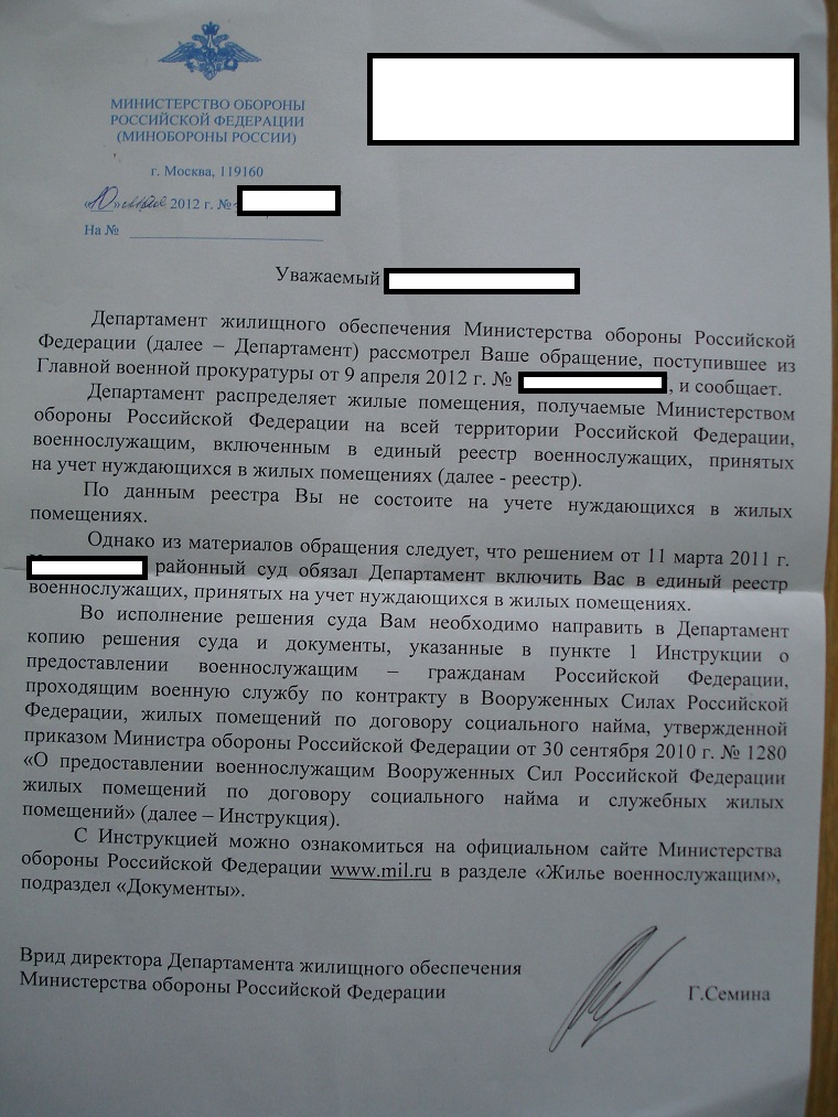 - внесение Департаментом жилищного обеспечения Министерства обороны РФ сведений единый реестр военнослужащих, принятых на учет нуждающихся в жилых помещениях о капитане запаса ___________: личный номер ________, паспорт ___________, выданный__________ УВД Дзержинского района г. Волгограда, ________ г. рождения, состав семьи – один, дата принятия на учет – ___________, место предоставление жилого помещения – г. Волгоград, категория – уволен с военной службы.