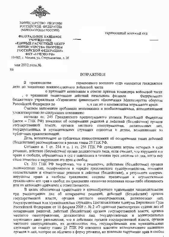 Стандартные возражения ЕРЦ в суде по требованиям военнослужащих:
