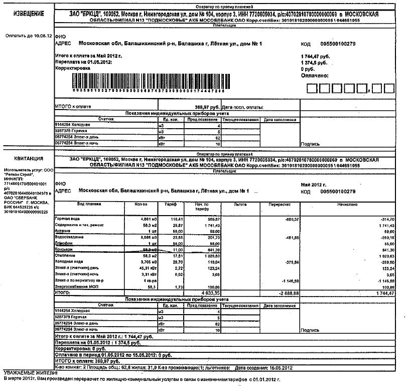 Вот кто-то скан платёжки выкладывал на Балашихинском форуме. Можно подставить свои квадратные метры в платежку и примерно просчитать. У меня тоже трешка 80,8 м. Я примерно просчитал, получилсь 5875 р. Но если убрать консъержа, за которого я не обязан платить, и не буду этого делать, а это по 11 руб/кв.м. х 80,8=888 рублей, то получается примерно 5000 рублей. Плюс-минус 500 руб, в зависимости от потребленной электроэнергии и воды.На сколько приходят квитанции за треху 80 метров?