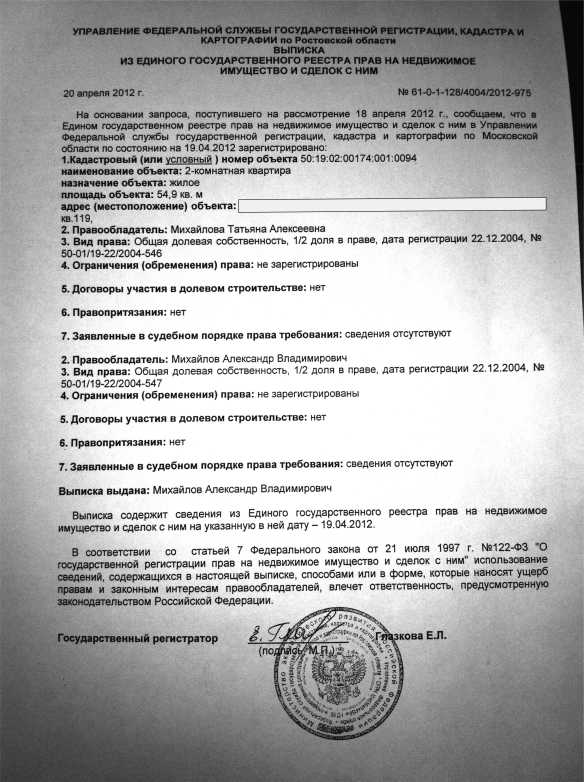 Выкладываю свою выписку. Нигде не указано, что тот Михайлов (который является правообладателем на самом деле) это не я. Кто знает, проконсультируйте. В нашем отделении ЕГРП говорят, что полные данные о правообладателе указываются когда с запросом обратился сам правообладатель. Так как я не являюсь правообладателем этой недвижимости, то в графе правообладатель пишут только его ФИО. У ЕГРП свои инструкции. В ДЖО это не устроило.