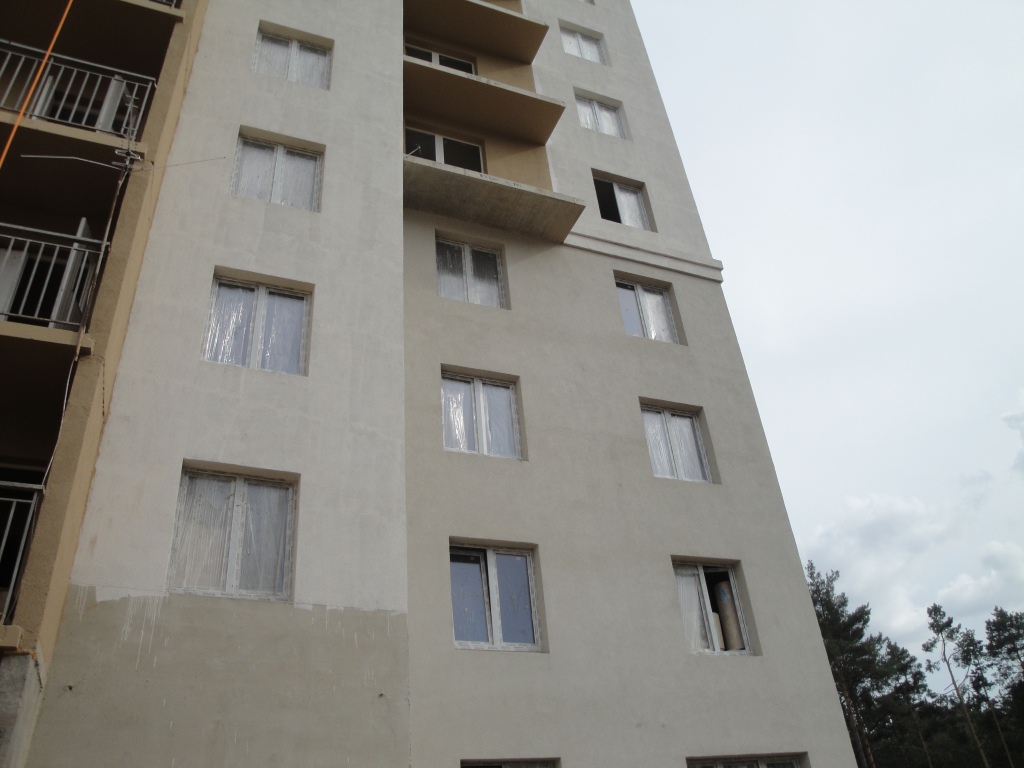 Двухподъездный дом утеплен и практически весь оштукатурен. Штукатурка накладывается по полимерной сетке.
