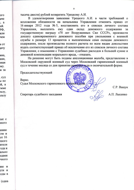 Я вот и написал, посмотрим, что придет: нач-ку ГВП:::::: Прошу Вас пояснить по выплате 1 ОДС за медаль 70 лет ВС??? Все имеющиеся решения судов, а также комментарий Начальника организационного управления Главной военной прокуратуры генерал-майора юстиции Бутрима Игоря Иосифовича (Российской газете), комментарии юристов в Российской газете говорят о том, что уволенным с 12-го года выплачивается один оклад денежного содержания за данную медаль. ЕДИНСТВЕННЫЙ Судья Ващук (МОСКВА) отказал мне в этой выплате, с аргументацией того, что эта медаль является юбилейной. Какие санкции к этому единственному некомпетентному судье возможно применить?