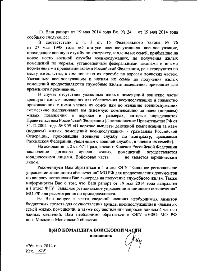 Ну всё лёд тронулся, как говорится 19 мая 2014 г. написал рапорт на аренду, вот ответ от командира части, у кого, какие мысли?